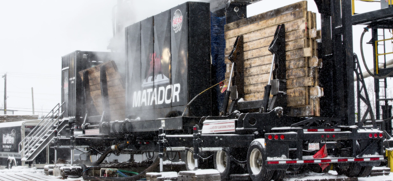 Clean matting is a top priority for Northern Mat & Bridge (NMB). We’ve pioneered innovative mat washing solutions to meet this need. Our eco-friendly mat washing unit not only allows companies to minimize land disturbance and recycles water. The Matador also provides assurance to private landowners and Indigenous communities that their land remains protected during industrial operations.